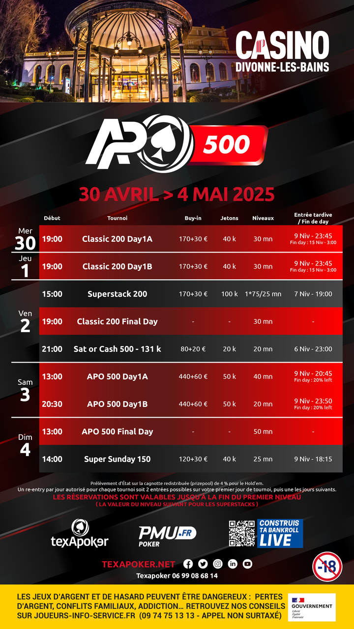 De retour au Casino de Divonne, Texapoker vous propose les APO 500 avec une structure sur 2 jours :