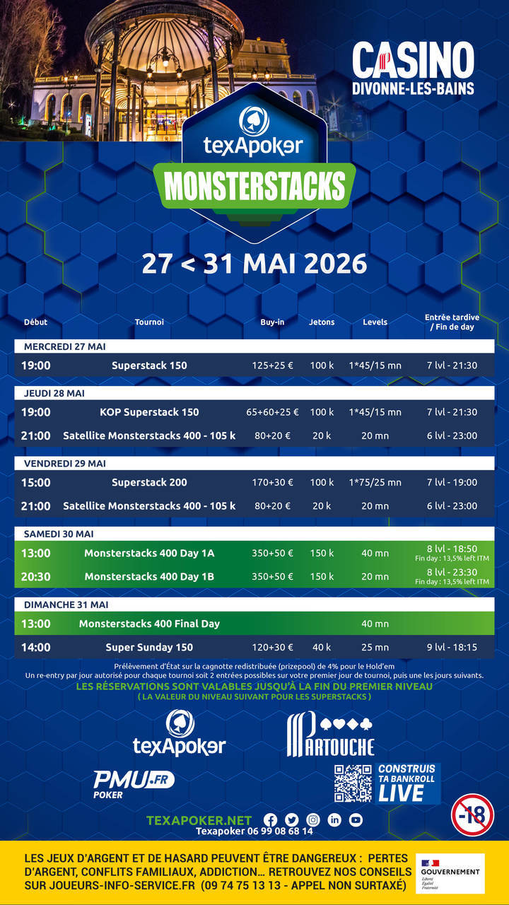 De retour au Casino de Divonne, Texapoker vous propose les Texapoker Monsterstacks 400 avec une structure sur 2 jours :
