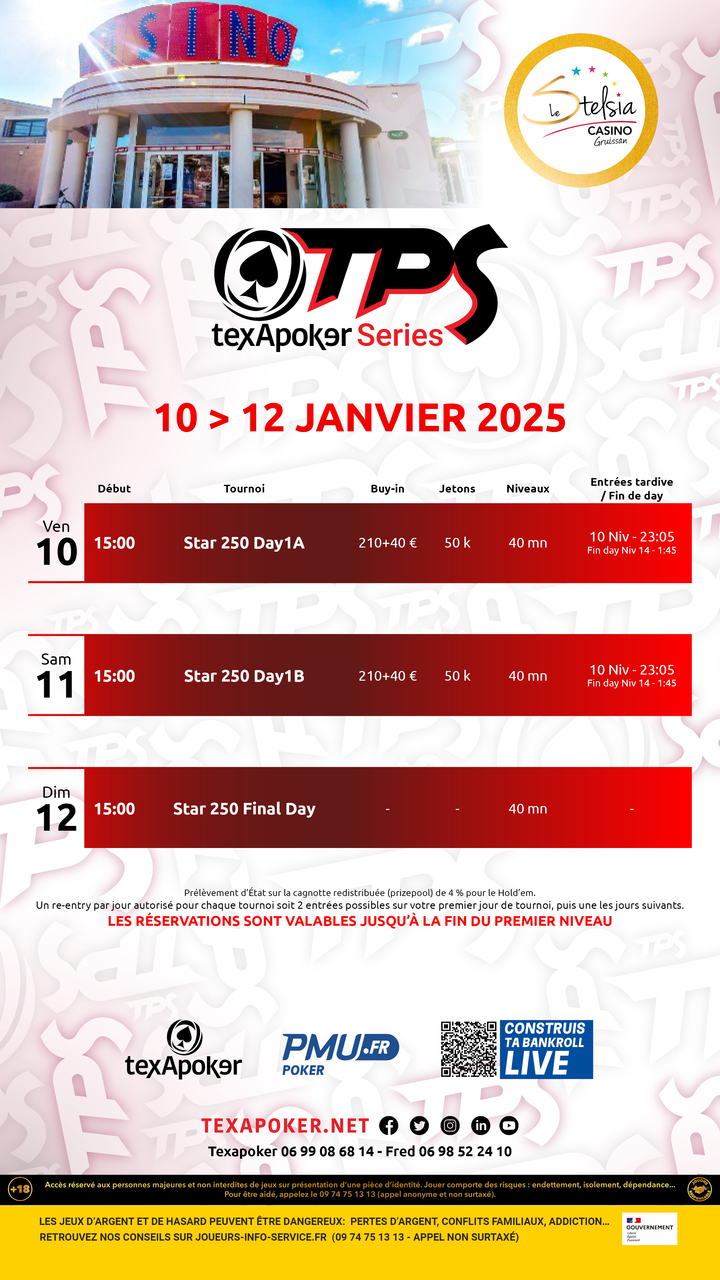Les tournois TPS sont la marque de fabrique de Texapoker ! Comme sur tous les tournois TPS, les tickets remportés sur PMU.fr sont utilisables sur l'ensemble des tournois.