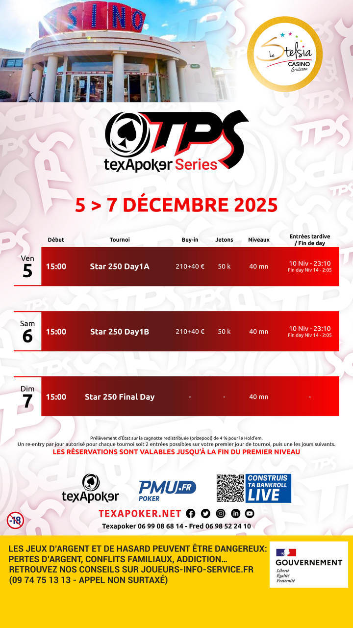 Les tournois TPS sont la marque de fabrique de Texapoker ! Comme sur tous les tournois TPS, les tickets remportés sur PMU.fr sont utilisables sur l'ensemble des tournois.