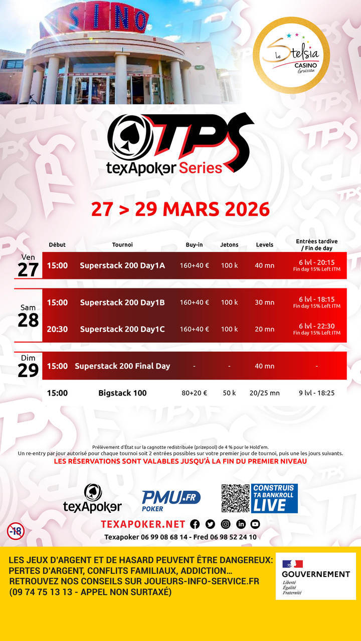 Les tournois TPS sont la marque de fabrique de Texapoker ! Comme sur tous les tournois TPS, les tickets remportés sur PMU.fr sont utilisables sur l'ensemble des tournois.