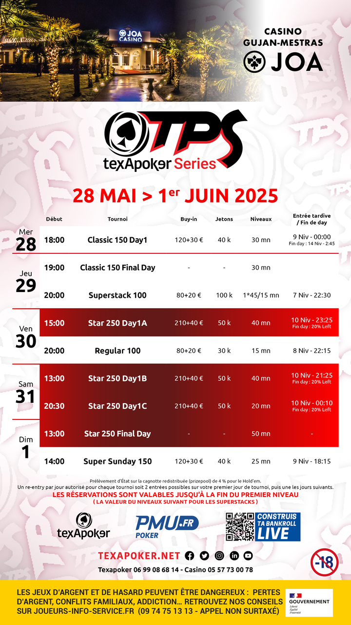 Les TPS sont de retour au casino JOA de Gujan Mestras ! Comme sur tous les tournois TPS, les tickets remportés sur PMU.fr sont utilisables sur l'ensemble des tournois.