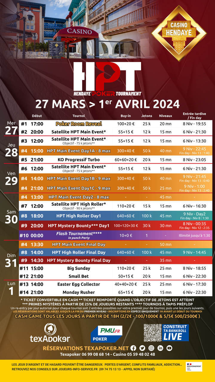 Le Casino d'Hendaye et Texapoker sont fiers d'inaugurer leur collaboration avec le Hendaye Poker Tournament ! En partenariat avec PMU.fr, les tickets remportés sur PMU.fr sont utilisables sur l'ensemble des tournois.