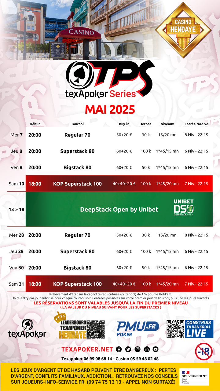Texapoker et le casino d'Hendaye pour vous présentent leur programme de tournois hebdomadaires ! Comme sur tous les tournois TPS, les tickets remportés sur PMU.fr sont utilisables sur l'ensemble des tournois.