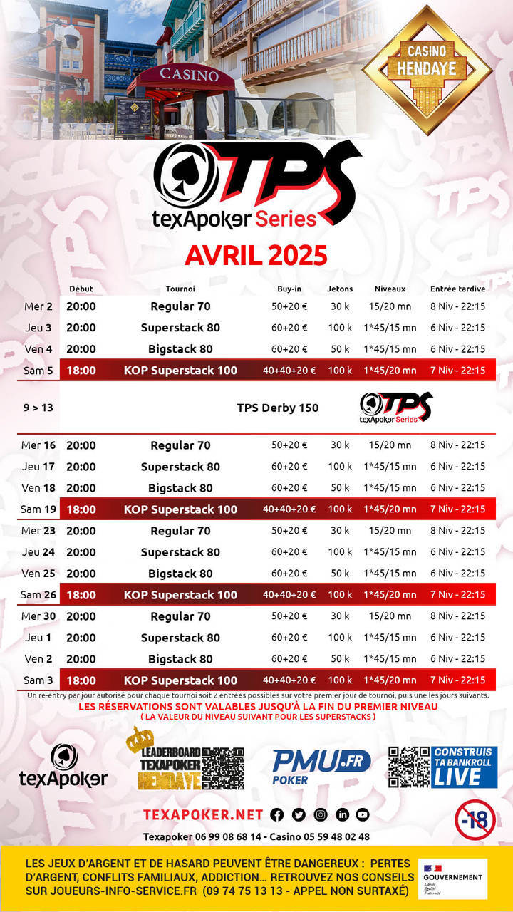 Texapoker et le casino d'Hendaye pour vous présentent leur programme de tournois hebdomadaires ! Comme sur tous les tournois TPS, les tickets remportés sur PMU.fr sont utilisables sur l'ensemble des tournois.