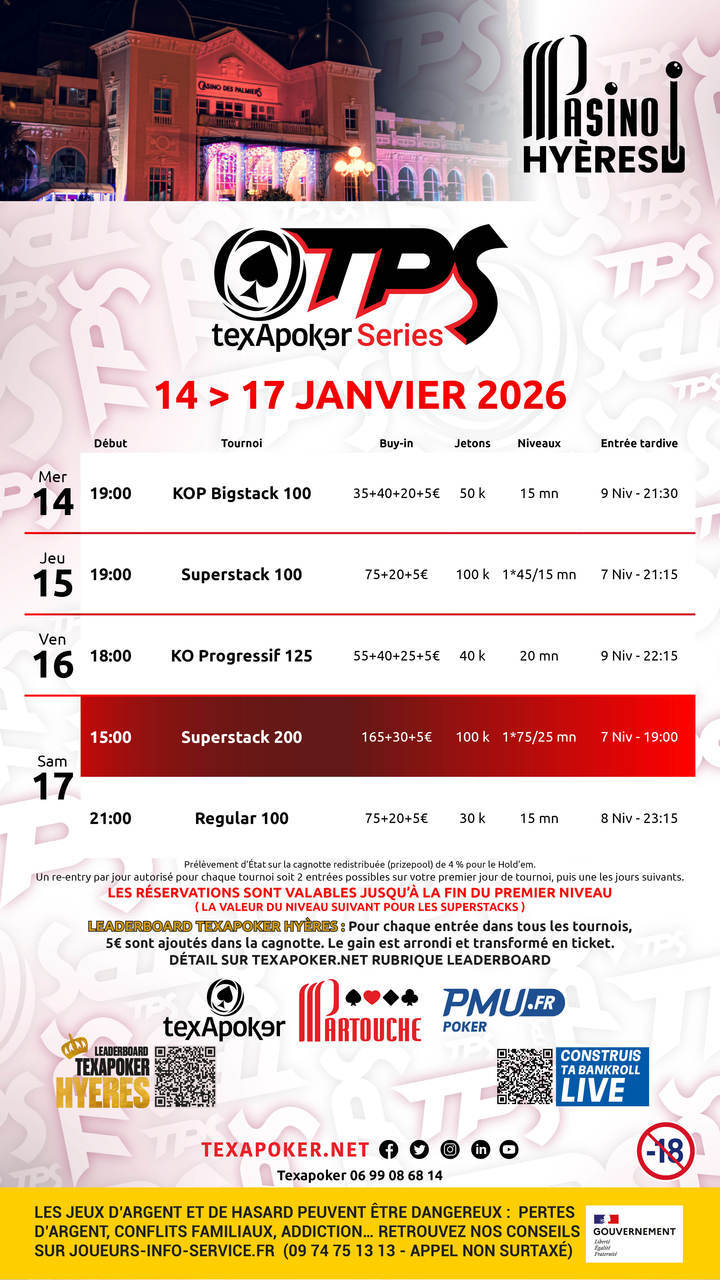 Retrouvez ainsi au Casino de Hyères un Regular à 100€, un Superstack à 100€ et 150€, ainsi que des des KO progressifs à 100€ et 125€.