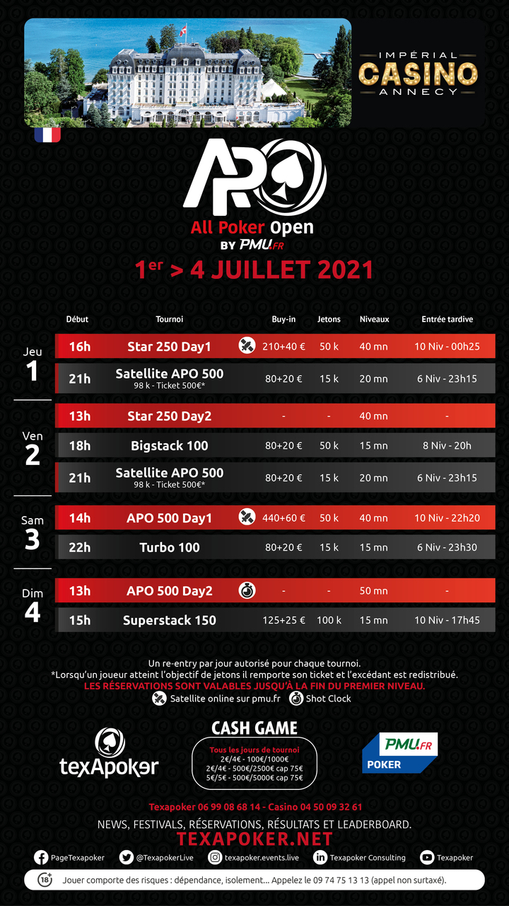 Afin d'inaugurer les tournois à l'Impérial Casino d'Annecy, Texapoker vous propose les APO 500, qui dureront du samedi au dimanche ! En plus d'un main event, vous pouvez retrouver un Star 250 en ouverture du festival, le tournoi phare de Texapoker, ainsi que des tournois à plus grande profondeur de stack, comme le Bigstack 100 et le Superstack 150, et un turbo !