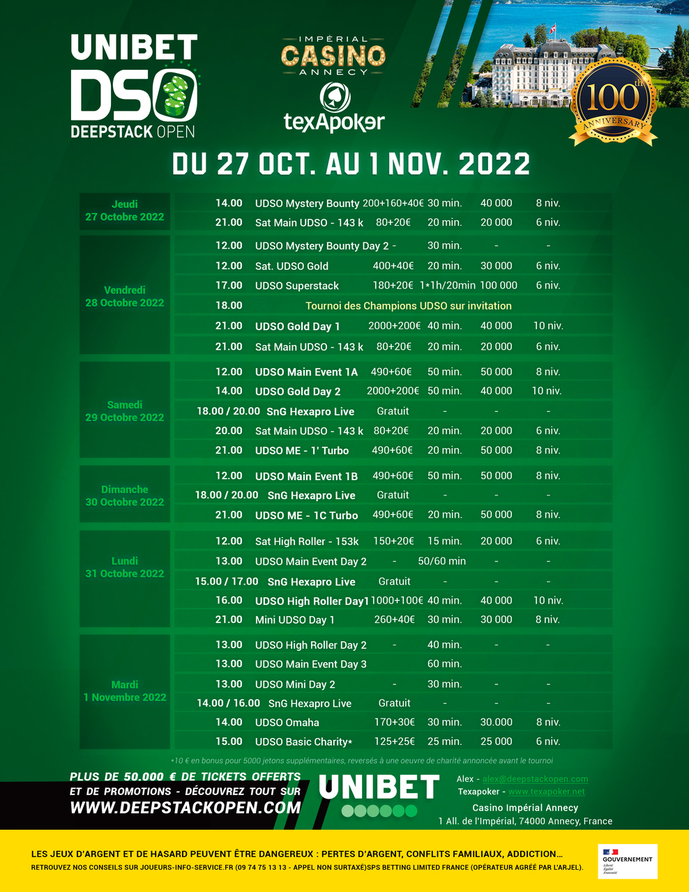Retrouvez ainsi le Main Event à 550 €, qui sera accompagné de nombreux tournois, et des satellites vous permettant de gagner votre place. Un UDSO Mystery Bounty afin d'ouvrir le bal, un Superstack, ainsi qu'un Mini UDSO, un Omaha et un Basic viendront se joindre à la fête !