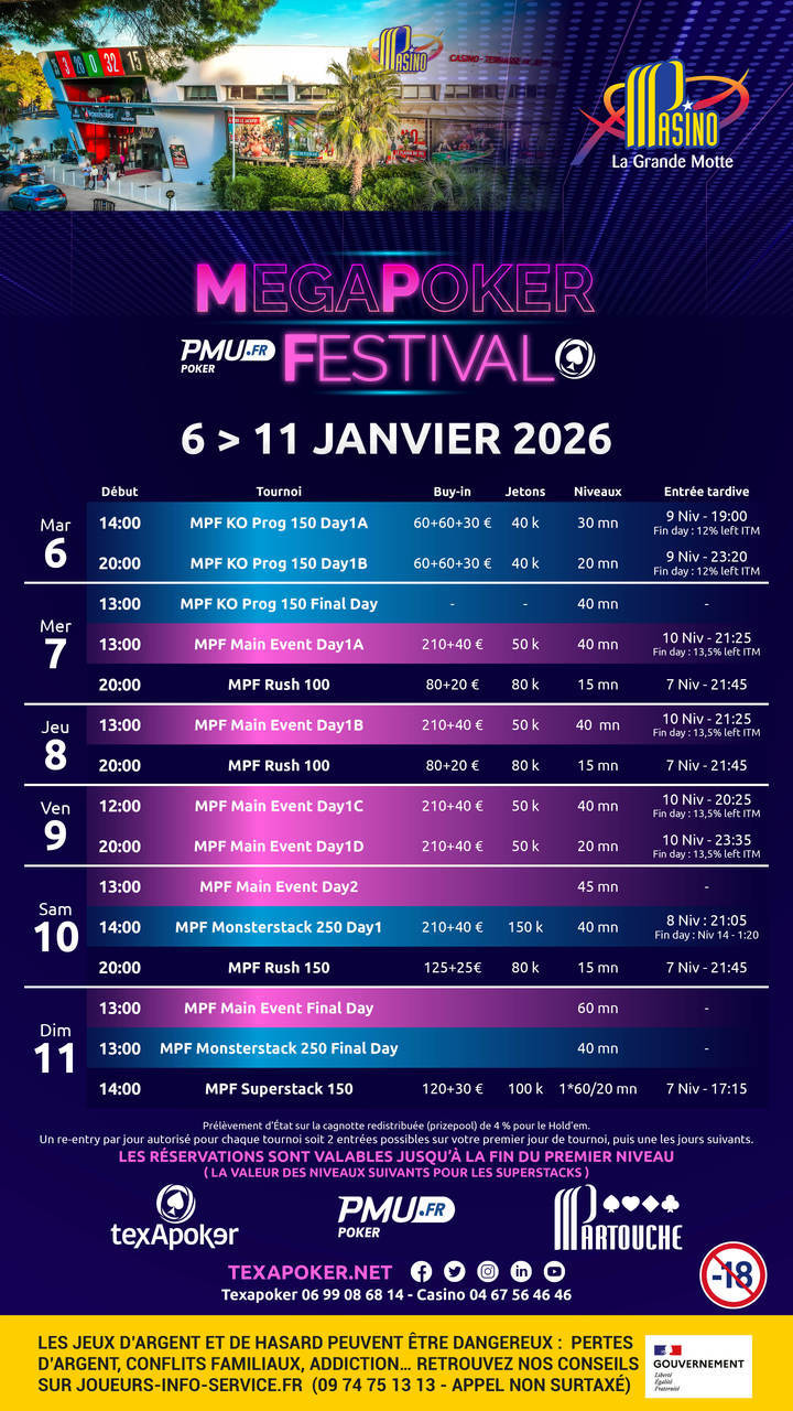 Texapoker, PMU.fr et le Pasino de La Grande-Motte sont fiers de vous annoncer le retour du MegaPoker Festival !