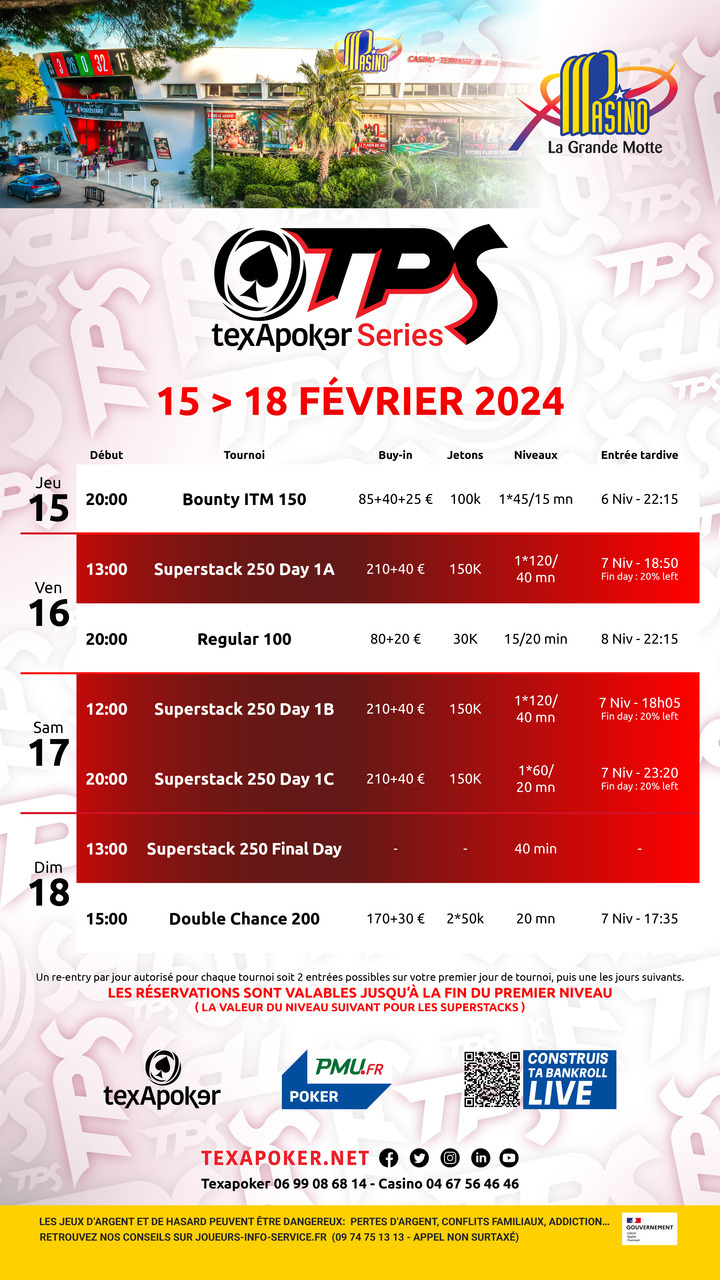 Enfin de retour au casino de La Grande Motte, retrouvez le Superstack 250, tournois phare de Texapoker, ainsi qu'un Bounty ITM 150, un Regular 100, et Double Chance 200 !