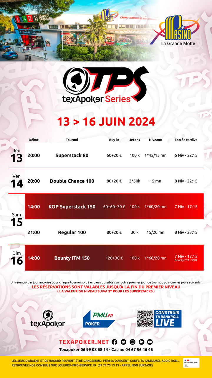 Le TPS est la marque de fabrique de Texapoker ! En partenariat avec PMU.fr, les tickets remportés sur PMU.fr sont utilisables sur l'ensemble des tournois.