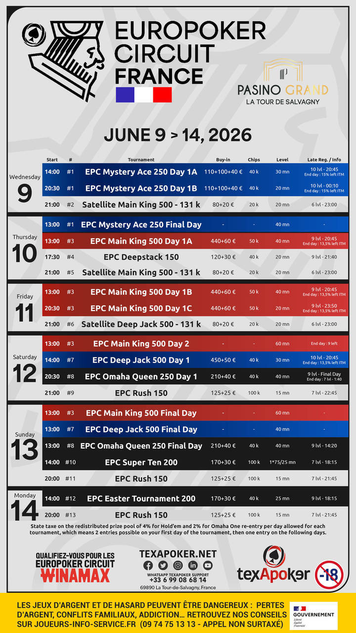 Texapoker présente le festival EuroPoker Circuit France, en partenariat avec Winamax ! La prochaine édition aura lieu au Pasino Grand La Tour-de-Salvagny !