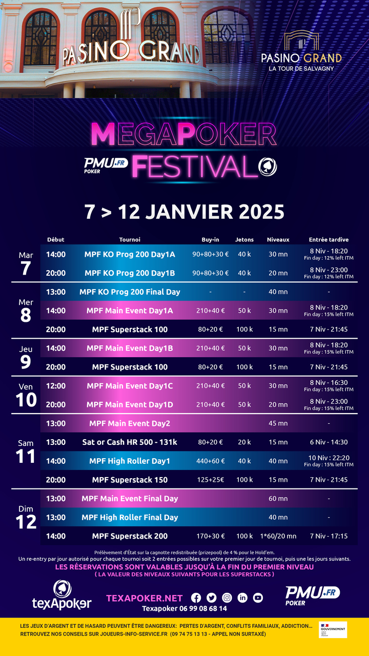 Texapoker, PMU.fr et le Pasino de La Tour-de-Salvagny sont fiers de vous annoncer le retour du MegaPoker Festival !
