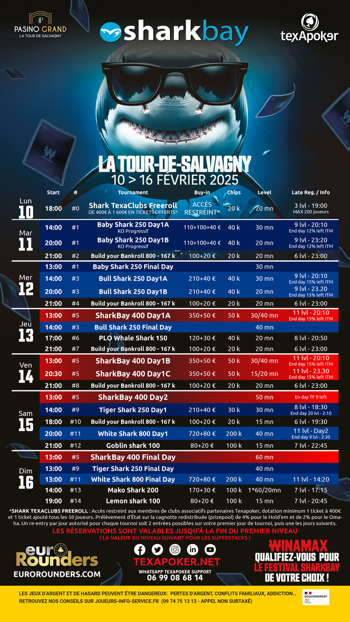 Le festival SharkBay est de retour au Pasino Grand La Tour-de-Salvagny avec Texapoker et son partenaire EuroRounders ! Cette deuxième édition du festival aura lieu du 10 au 16 février.