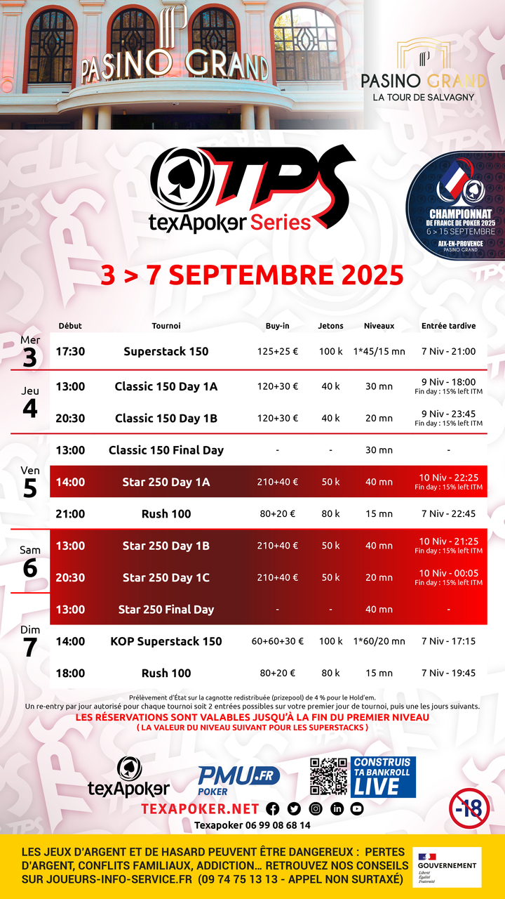 Le TPS est la marque de fabrique de Texapoker ! Comme sur tous les tournois TPS, les tickets remportés sur PMU.fr sont utilisables sur l'ensemble des tournois.