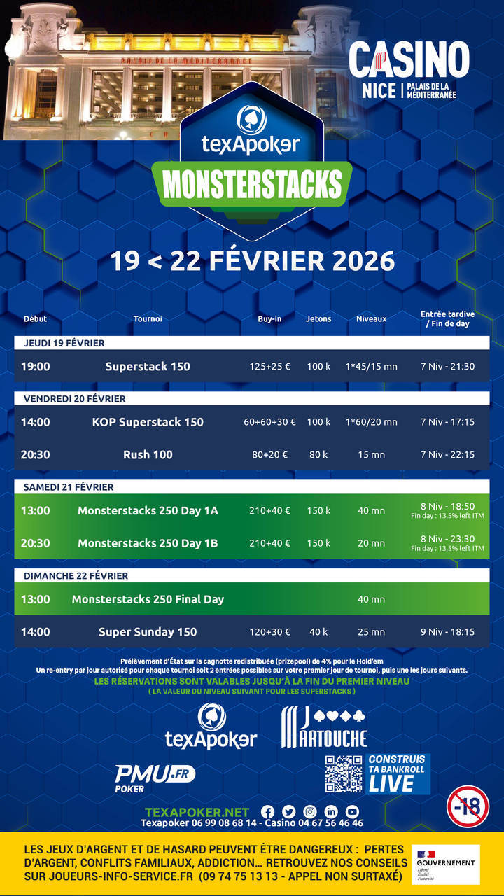Texapoker est de retour au Casino de Nice Palais de la Méditerranée avec les Texapoker Monsterstacks ! Les tickets remportés sur PMU.fr sont utilisables sur l'ensemble des tournois.