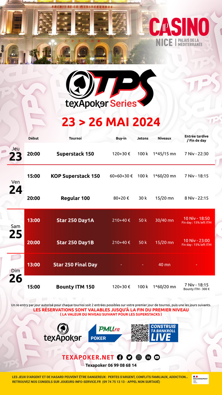 Retrouvez ainsi au Casino de Nice le Star 250, un Superstack 150, un KOP Superstack 150, un Regular 100 et un Bounty ITM 150.