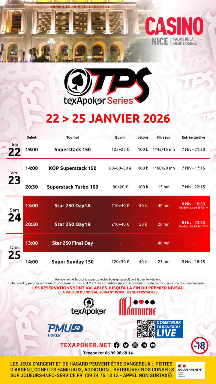 Le TPS est la marque de fabrique de Texapoker ! En partenariat avec PMU.fr, les tickets remportés sur PMU.fr sont utilisables sur l'ensemble des tournois.