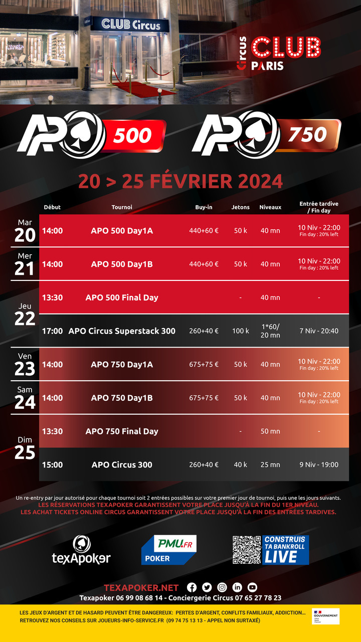 Découvrez ainsi en Main Event un APO 750, tournoi phare de Texapoker, ainsi qu'un APO 500 !