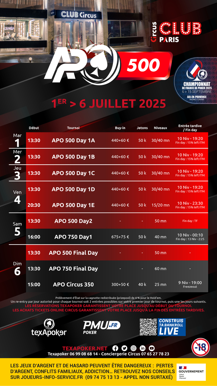 Découvrez ainsi en Main Event un APO 500, tournoi phare de Texapoker
