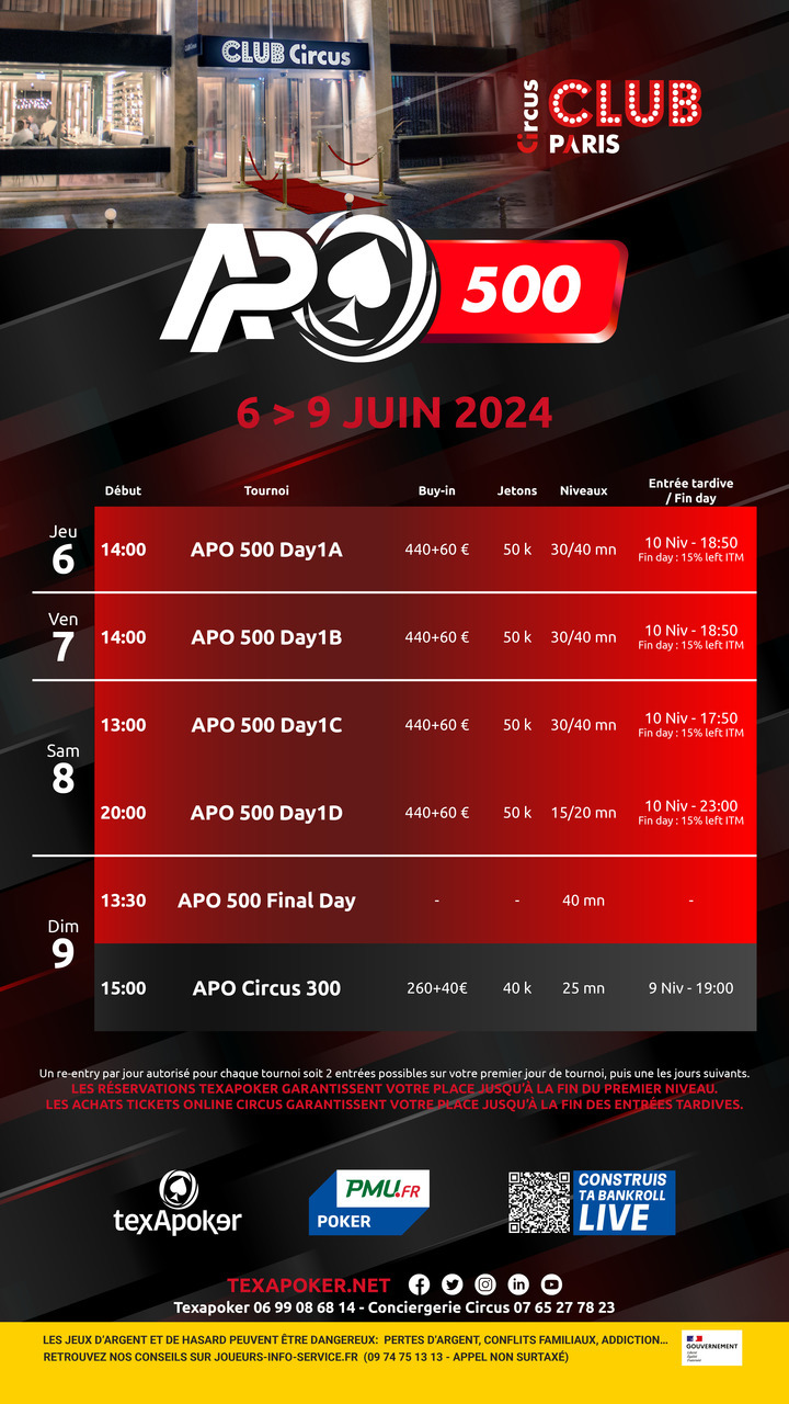 Découvrez ainsi en Main Event un APO 500, tournoi phare de Texapoker