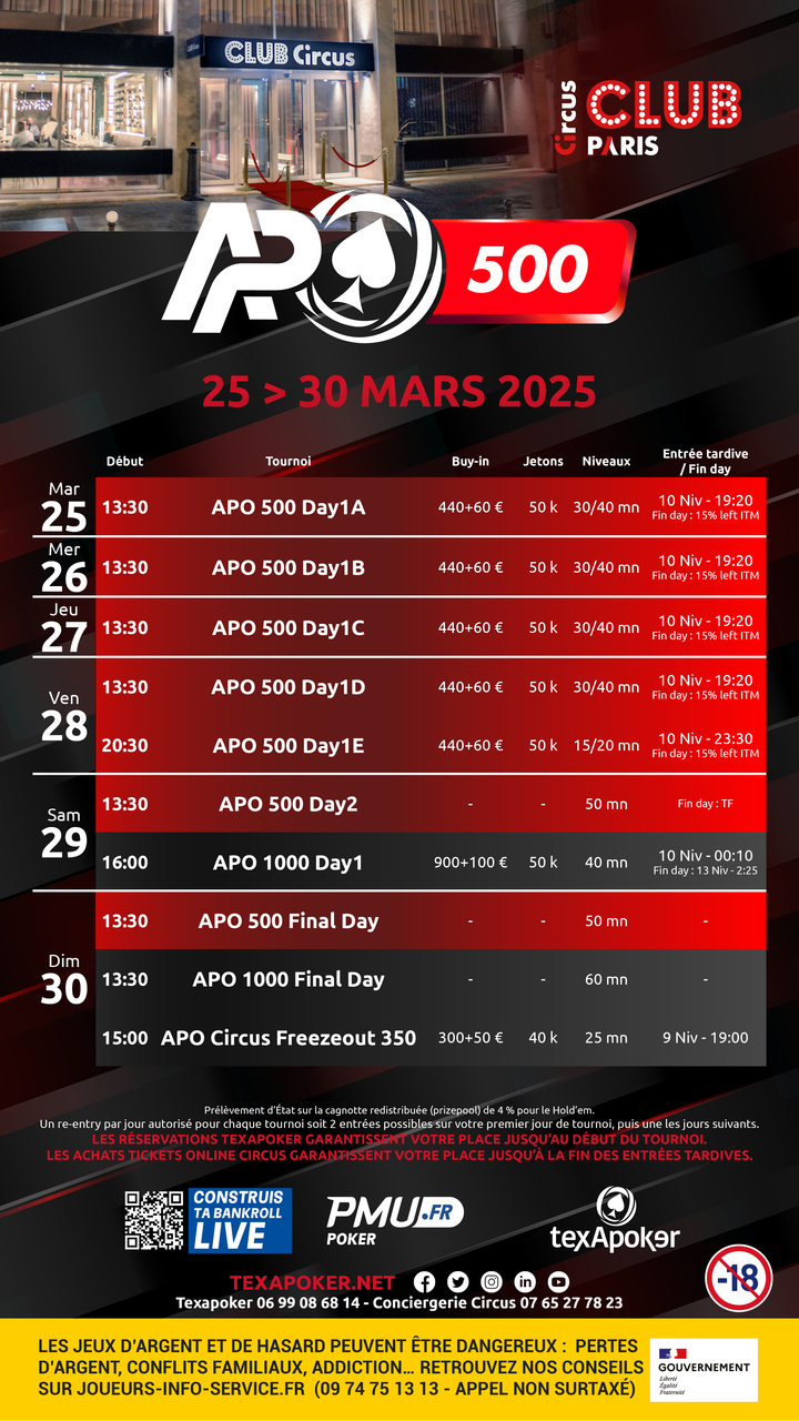 Découvrez ainsi en Main Event un APO 500, tournoi phare de Texapoker