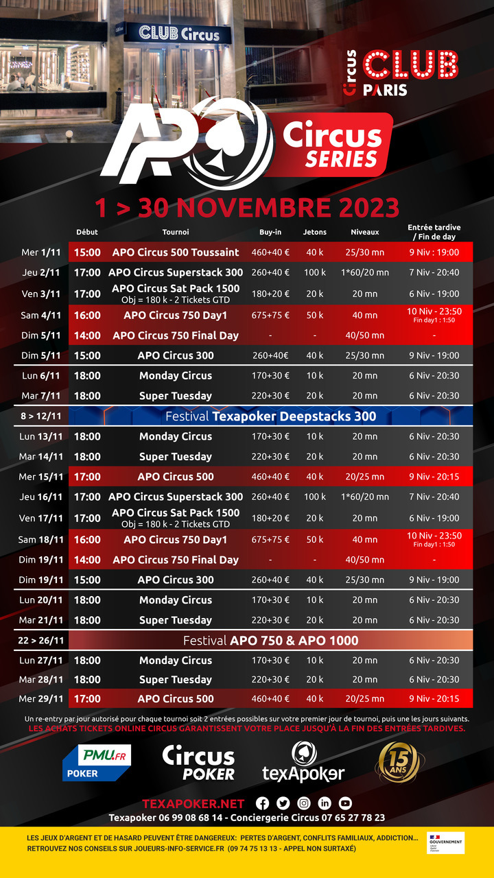 Texapoker et le Club Circus vous présentent ses tournois réguliers, les APO Circus Series !