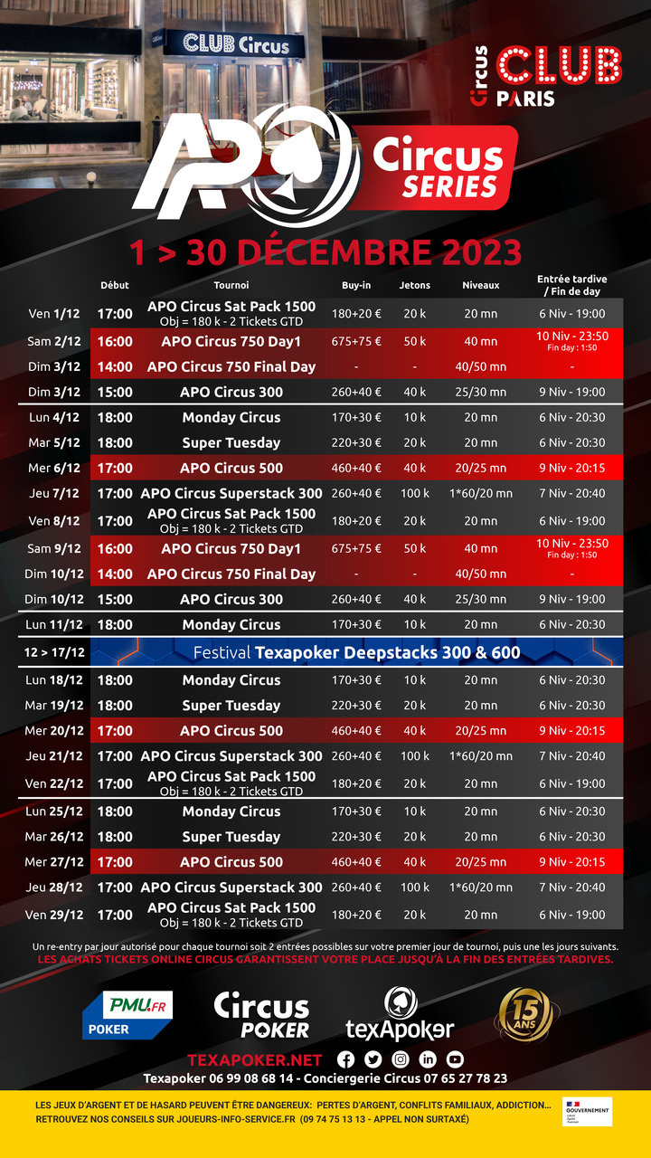 Vous pourrez ainsi retrouver chaque mercredi un APO Circus à 500€, un APO Circus Double Chance 300 le jeudi, un APO Circus sat pack 1500 le vendredi, un APO 750 du samedi au dimanche, et dimanche un APO Circus à 300€.