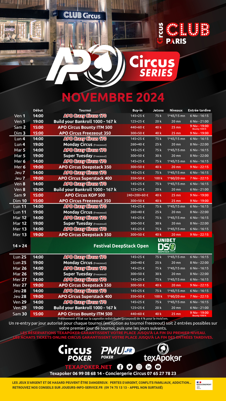 Vous pourrez ainsi retrouver des Crazy Circus 170 du lundi au vendredi, chaque lundi le Monday Circus, le Super Tuesday le mardi, mercredi un APO Circus Deepstack 350, un APO Circus Superstack 400 le jeudi, un Build your Bankroll pour remporter 1 000€ le vendredi, un APO Circus KOP 500 le samedi, et dimanche un APO Circus Freezeout à 350€.