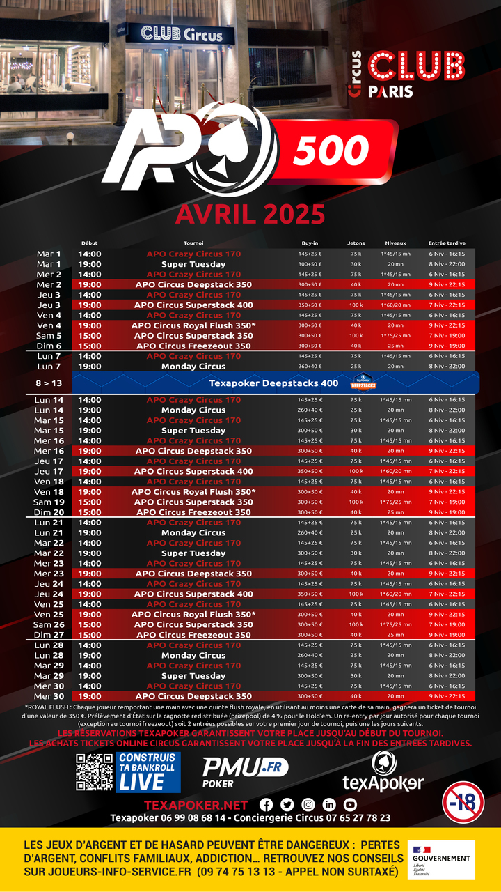 Vous pourrez ainsi retrouver des Crazy Circus 170 du lundi au vendredi, chaque lundi le Monday Circus, le Super Tuesday le mardi, mercredi un APO Circus Deepstack 350, un APO Circus Superstack 400 le jeudi, un APO Circus Royal Flush 350 le vendredi, un APO Circus KOP 500 le samedi, et dimanche un APO Circus Freezeout à 350€.