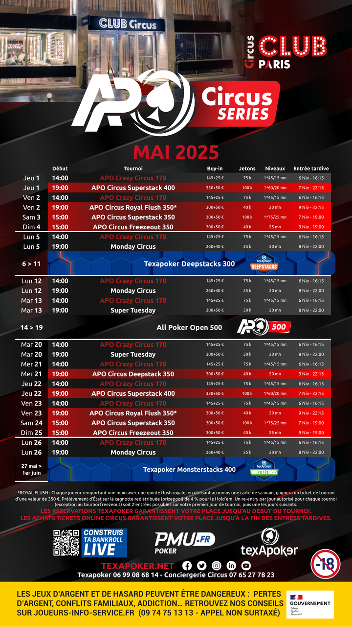 Texapoker et le Club Circus vous présentent ses tournois réguliers, les APO Circus Series !