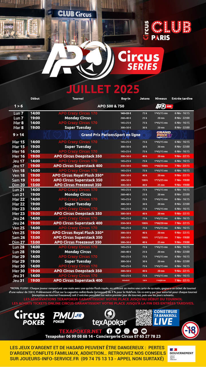 Vous pourrez ainsi retrouver des Crazy Circus 170 du lundi au vendredi, chaque lundi le Monday Circus, le Super Tuesday le mardi, mercredi un APO Circus Deepstack 350, un APO Circus Superstack 400 le jeudi, un APO Circus Royal Flush 350 le vendredi, un APO Circus KOP 500 le samedi, et dimanche un APO Circus Freezeout à 350€.