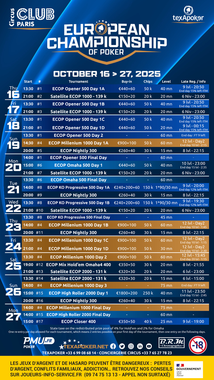 L’ECOP Millenium proposera la structure Millenium profonde sur 4 jours avec des niveaux de 60 minutes. Le Day 1A de cet événement aura lieu le dimanche 19 octobre et le Day 1B le 23 octobre pour enchaîner ensuite jusqu’à la fin du festival.