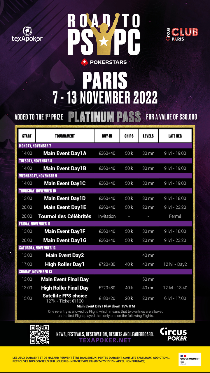 Afin de remporter votre Pass pour les PSPC, il vous faudra sortir vainqueur du Main Event à 400€, avec 7 jours 1 pour maximiser vos chances de vous qualifier ! En parallèle, un High Roller 800€ sera mis en place et viendra clôturer le festival.