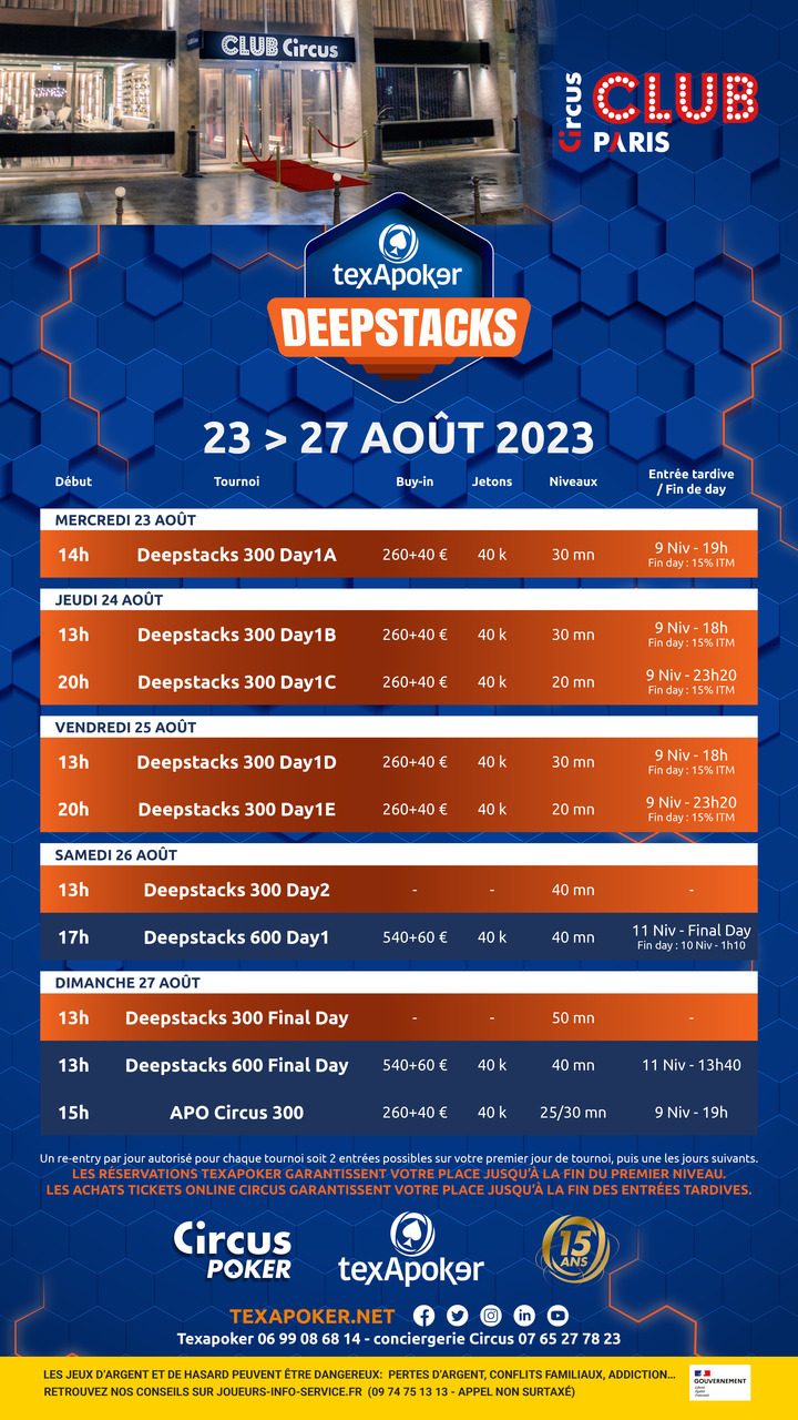 Découvrez ainsi en Main Event un Deepstacks 300 ainsi qu'un Deepstacks 600, et un APO Circus 300 pour clotûrer le festival