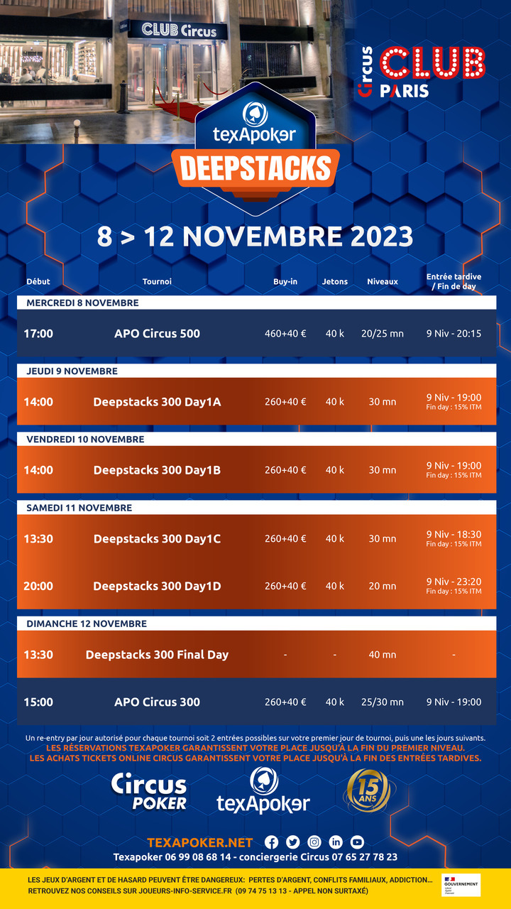 Découvrez ainsi en Main Event un Deepstacks 300 ainsi que les tournois hebdomadaires APO Circus Series !