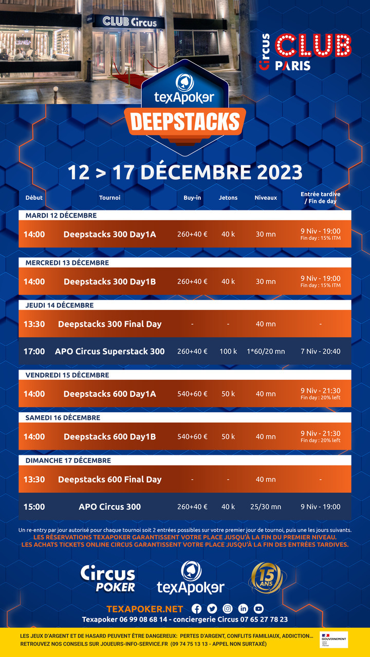 Découvrez ainsi en Main Event un Deepstacks 300, un Deepstacks 600 ainsi que les tournois hebdomadaires APO Circus Series !