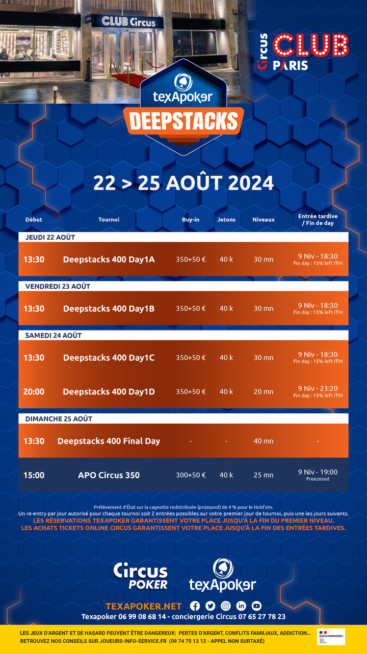 Découvrez ainsi en Main Event un Deepstacks 400 ainsi que les tournois hebdomadaires APO Circus Series !