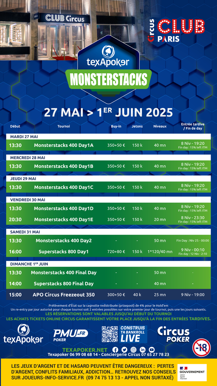 Texapoker est de retour au Club Circus Paris, avec les Texapoker Monsterstacks!