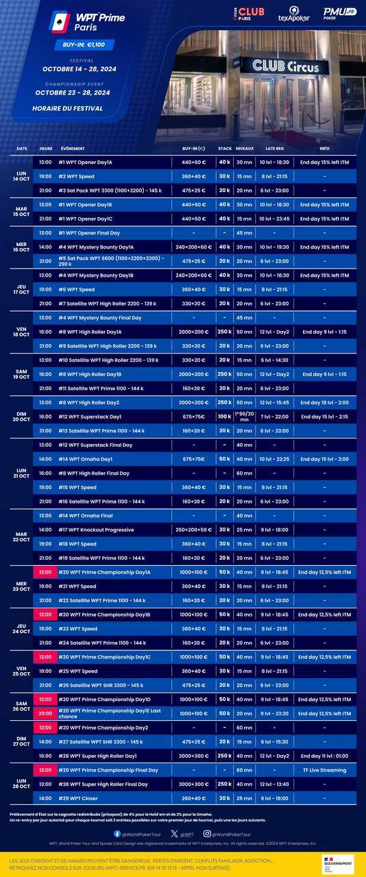 En ouverture, un Opener à 500€ débutera le lundi 14 octobre avant un Mystery Bounty à 500€ à partir du mercredi 16 octobre. Un High Roller à 2 200€ aura lieu du 18 au 20 octobre alors qu'un Super High Roller à 3 300€ est aussi au programme samedi 27 et dimanche 28 octobre. Un Omaha à 750€ sera aussi proposé.