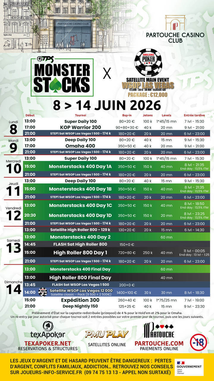 Texapoker est de retour au Partouche Casino Club à Paris avec les Texapoker Monsterstacks ! Les tickets remportés sur PMU PLAY sont utilisables sur l'ensemble des tournois.