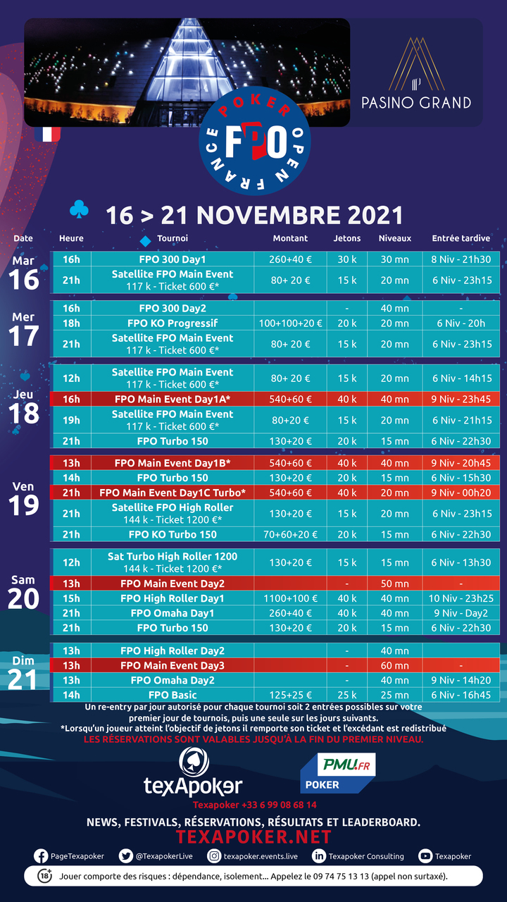 Au programme donc un FPO 300 en ouverture avant les Jours 1A, 1B et 1C du Main Event à 600€ les jeudi 18 et vendredi 19 novembre (40 000 jetons de départ, niveaux de 40 minutes). Le week-end sera aussi l'occasion d'un High Roller à 1 200€, d'un Omaha à 300€ ou encore de tournois annexes à faible coût.