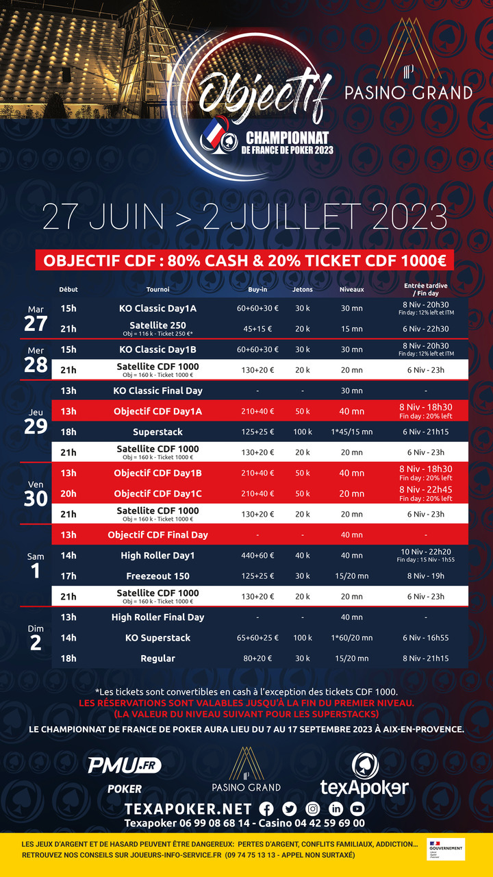 Texapoker et le pasino Grand d'Aix-En-Provence vous présentent l'Objectif Championnat de France ! Participez au festival et tentez de remporter votre ticket pour le Championnat de France qui aura lieu au Pasino Grand Aix-En-Provence du 7 au 17 septembre 2023 !
