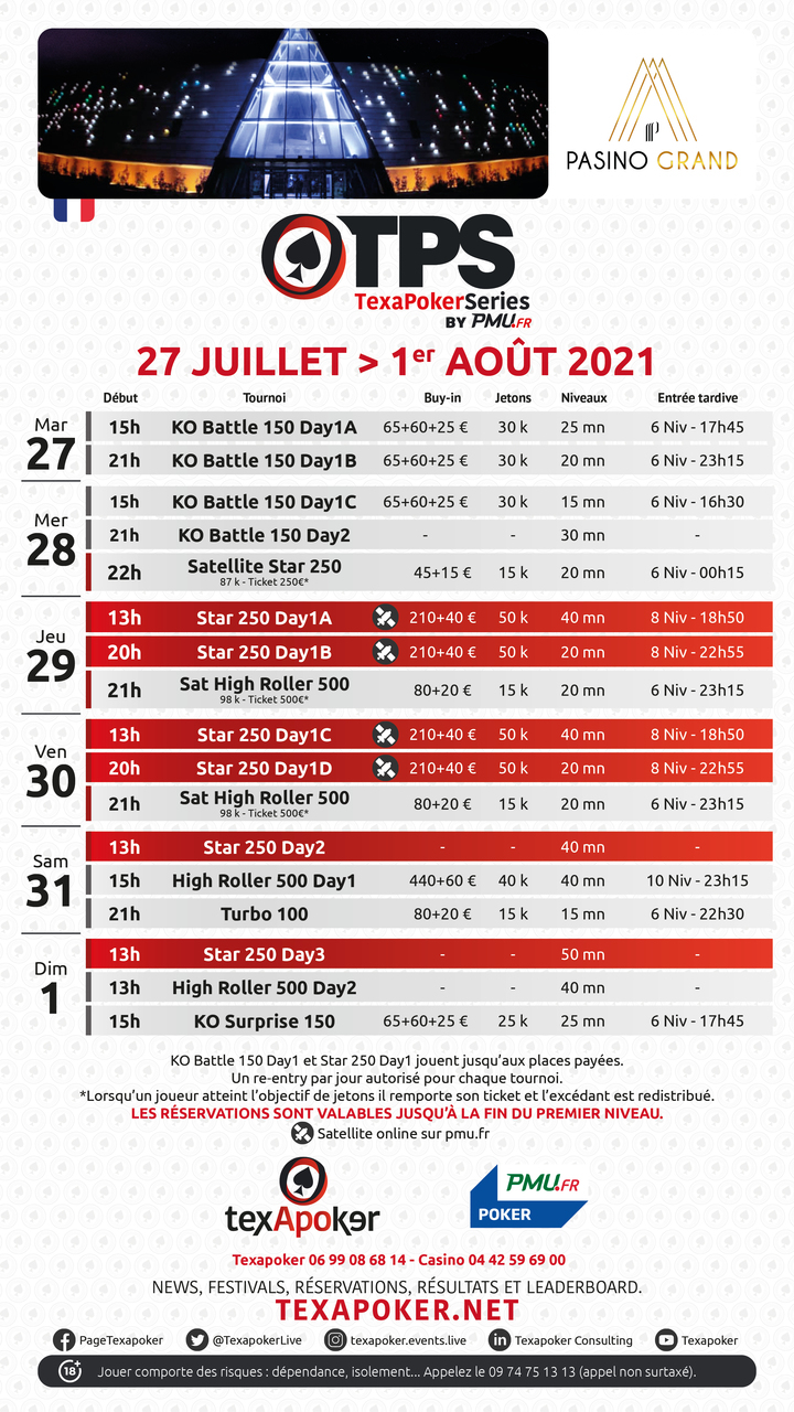 Retrouvez ainsi au Pasino Grand le Star 250, le tournoi phare de Texapoker, et également en ouverture de festival un KO Battle 150 !