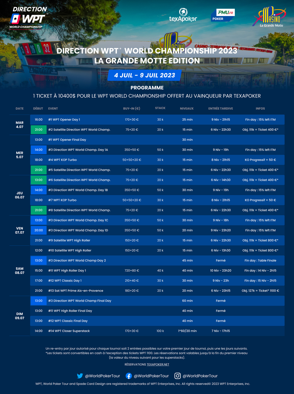 Retrouvez un Main Event à 400€ au Pasino de La Grande Motte, à noter qu'en plus du prizepool global redistribué aux joueurs, le vainqueur du Main Event se verra offrir par Texapoker un ticket à 10 400$ pour disputer le WPT World Championship au Wynn à Las Vegas en décembre 2023.