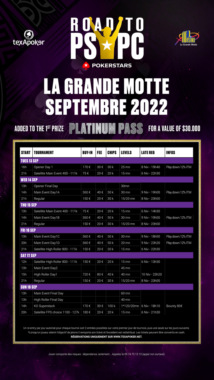 Afin de remporter votre Pass pour les PSPC, il vous faudra sortir vainqueur du Main Event à 400€, avec 4 jours 1 pour maximiser vos chances de vous qualifier ! Plusieurs sides seront mis en place, avec un High Roller 800€, un Regular 170€ et un KO Superstack 200€