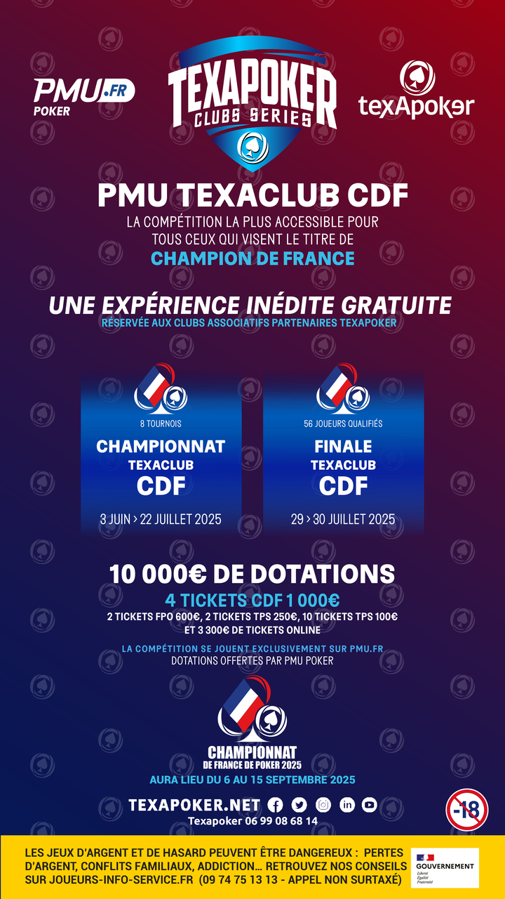 Cette année pour les Texapoker Clubs Series, la compétition est composée d'un championnat en 8-Max. Cette année, les Championnat de France sont à l'honneur, avec au total 4 tickets à 1 000€ à remporter !