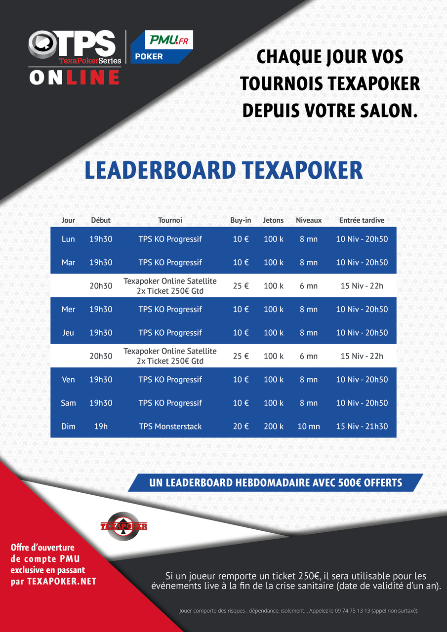 Vous aurez toujours la possibilité de participer aux satellites TPS 250 les mardis et jeudis, vous permettant de participer aux tournois live à venir de Texapoker.