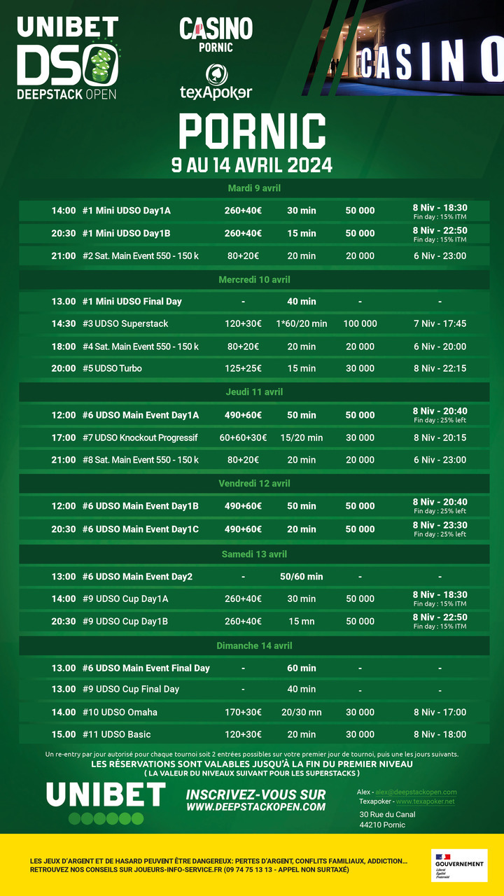 L' Unibet DeepStack Open esr de retour pour 2024, et toujours en partenariat avec Texapoker ! La prochaine étape de ce circuit se déroulera au Casino de Pornic !