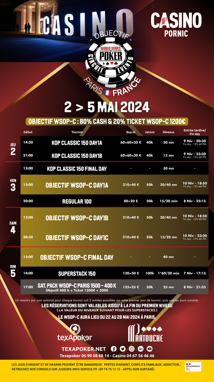 Le WSOP-C Paris arrive à grand pas, et le Casino de Pornic et Texapoker vous proposent un festival afin de vous qualifier pour cet événement !